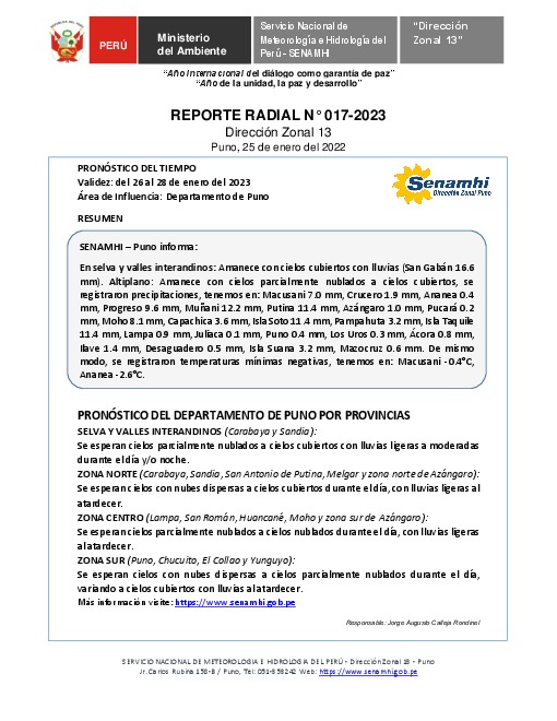 SENAMHI-DZ13 Puno: Reporte radial del 25 de enero del 2023