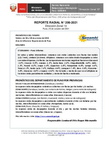 SENAMHI-DZ13 Puno: Reporte radial del 25 de octubre del 2021