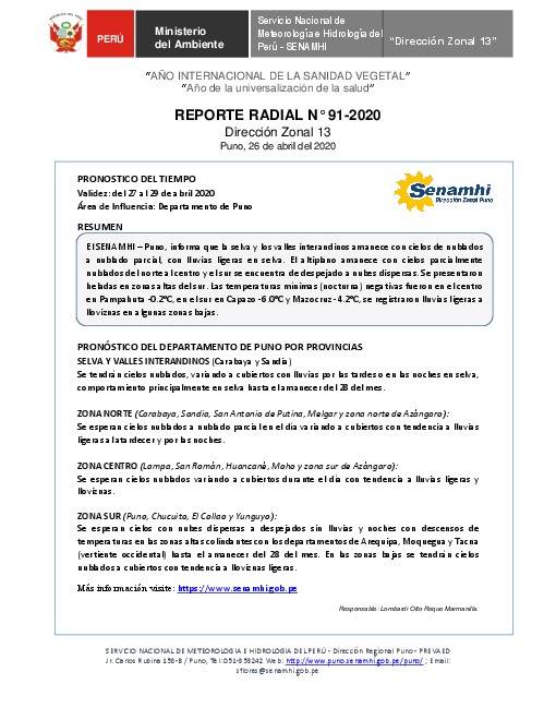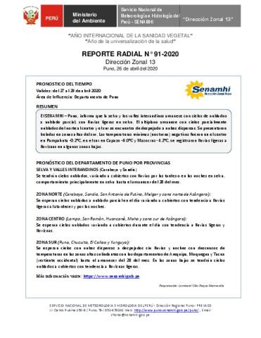 SENAMHI-DZ13 Puno: Reporte radial de 26 de abril del 2020