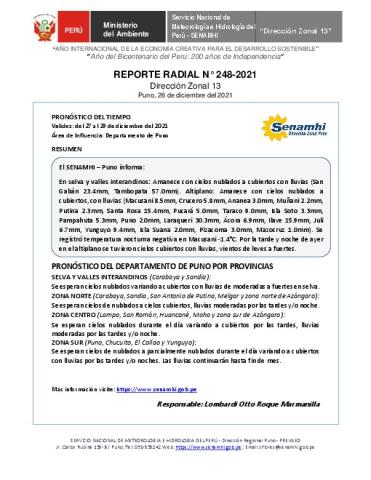 SENAMHI-DZ13 Puno: Reporte radial del 26 de diciembre del 2021