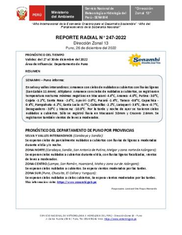 SENAMHI-DZ13 Puno: Reporte radial del 26 de diciembre del 2022