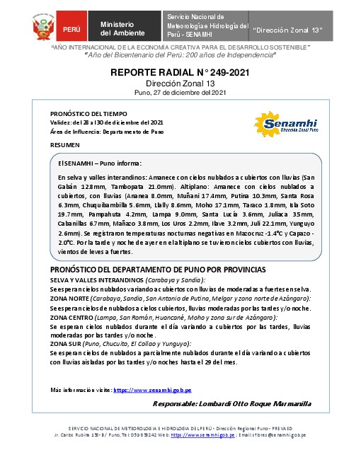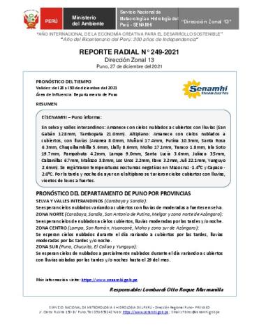 SENAMHI-DZ13 Puno: Reporte radial del 27 de diciembre del 2021