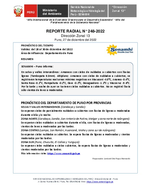 SENAMHI-DZ13 Puno: Reporte radial del 27 de diciembre del 2022