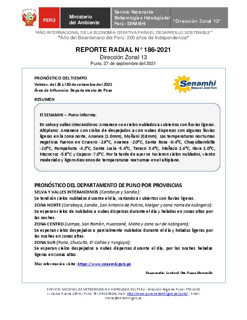SENAMHI-DZ13 Puno: Reporte radial del 27 de septiembre del 2021