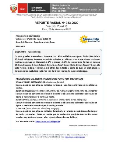 SENAMHI-DZ13 Puno: Reporte radial del 28 de febrero del 2022