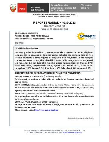 SENAMHI-DZ13 Puno: Reporte radial del 28 de febrero del 2023