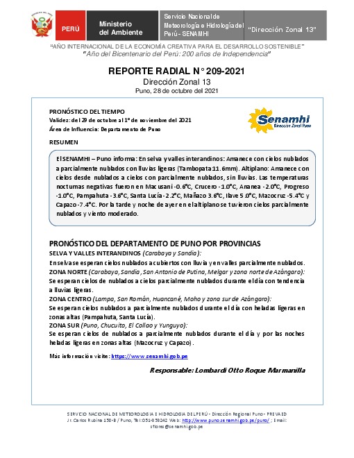 SENAMHI-DZ13 Puno: Reporte radial del 28 de octubre del 2021