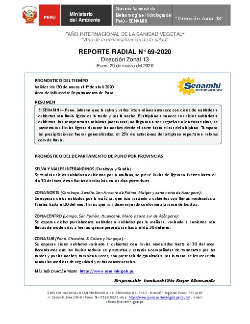 SENAMHI-DZ13 Puno: Reporte radial de 29 de marzo del 2020
