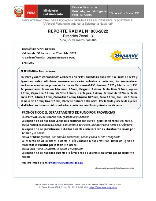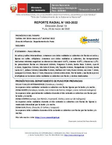 SENAMHI-DZ13 Puno: Reporte radial del 29 de marzo del 2022