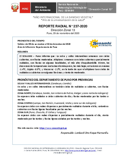 SENAMHI-DZ13 Puno: Reporte radial de 29 de noviembre del 2020