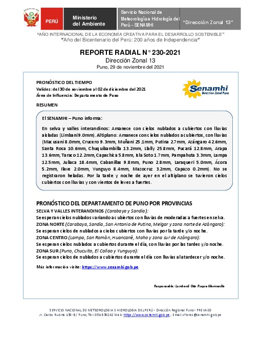SENAMHI-DZ13 Puno: Reporte radial del 29 de noviembre del 2021