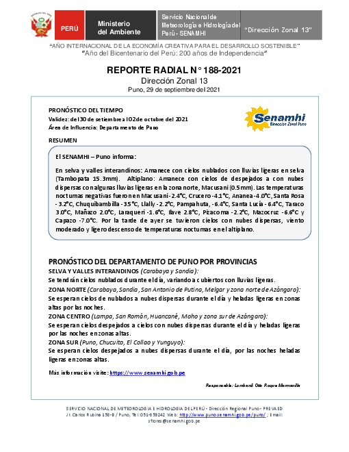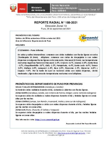 SENAMHI-DZ13 Puno: Reporte radial del 29 de septiembre del 2021