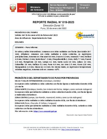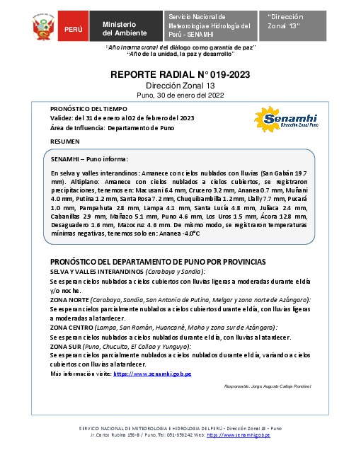 SENAMHI-DZ13 Puno: Reporte radial del 30 de enero del 2023