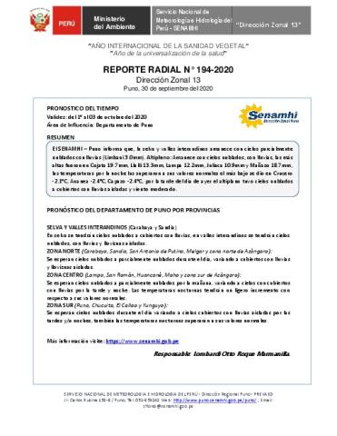 SENAMHI-DZ13 Puno: Reporte radial de 30 de setiembre del 2020