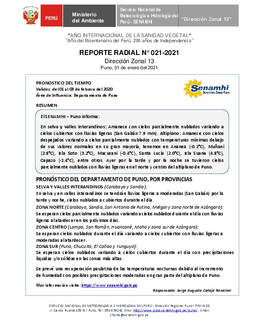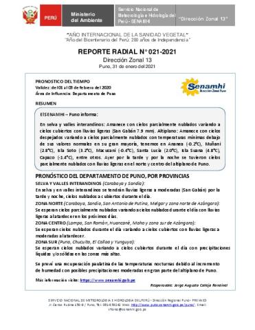 SENAMHI-DZ13 Puno: Reporte radial de 31 de enero del 2021