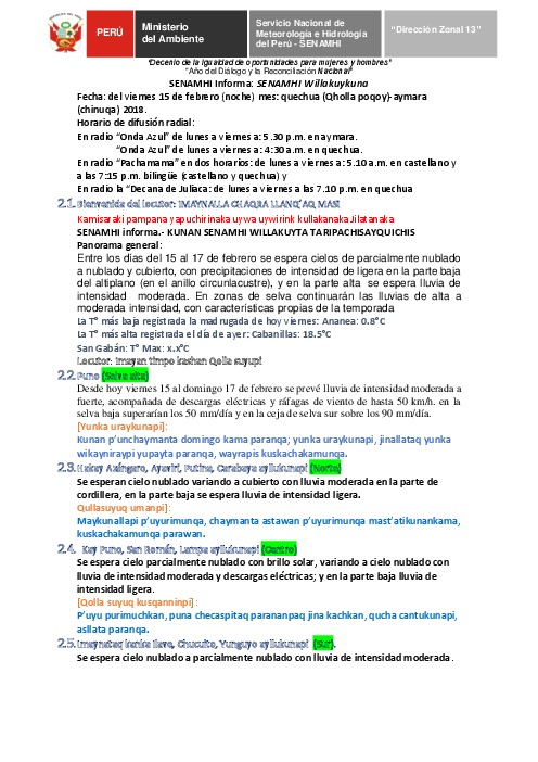 Entre los días del 15 al 17 de febrero se espera cielos de parcialmente nublado a nublado y cubierto, con precipitaciones de intensidad de ligera en la parte baja del altiplano (en el anillo circunlacustre), y en la parte alta se espera lluvia de intensidad moderada. En zonas de selva continuarán las lluvias de alta a moderada intensidad, con características propias de la temporada.