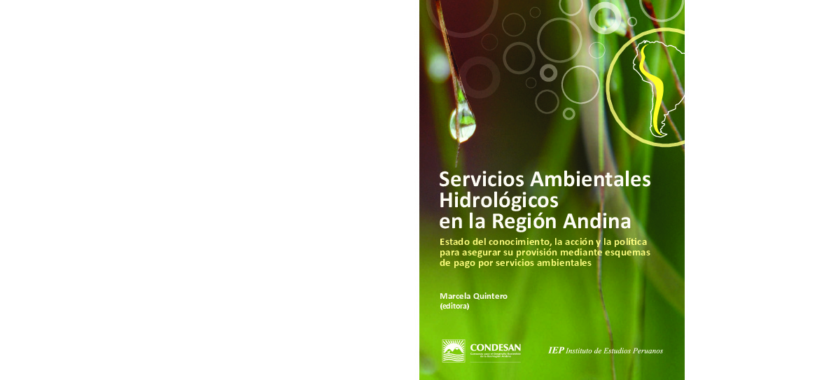 En esta publicación se desarrolla en detalle la visión integral sobre servicios ambientales hidrológicos en los Andes y se presenta el estado de conocimiento, de la acción y de las políticas. La adecuada gestión de los servicios ambientales hídricos es un fin para la sociedad académica, el sector de conservación y desarrollo, y las agencias de gobierno, pero a la vez es un medio para lograr el buen vivir para todas y todos, en armonía con la naturaleza.