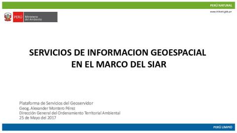 Presentación realizada en la X Reunión Técnica dirigida a los Administradores de los Sistemas de Información Ambiental SIAR - SIAL, por el Geog. Alexander Montero Pérez, especialista del Ministerio del Ambiente, en la cuidad de Ayacucho. La Reunión Técnica se llevó a cabo los días 25 y 26 de Mayo, organizado por el Ministerio del Ambiente.