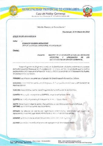 El municipio cuenta con un plan de gestion de residuos solidos probados mediante ordenanza municipal 0023-2016-MPCH APROBADO en el año 2016 que tiene una duracion de 10 años.