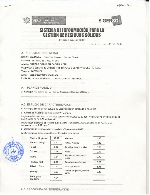 Se presenta el informe anual 2012 del Sistema de Gestion de Residuos Solidos de la Provincia de Picota