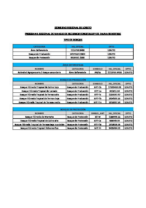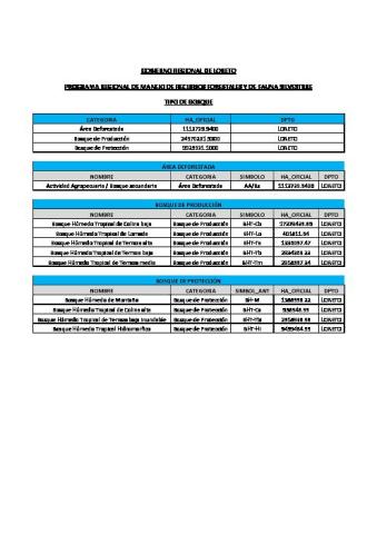 El presente documento que contiene información estadística fue elaborado por el Programa Regional de Manejo de Recursos Forestales y de Fauna Silvestre, en donde da a conocer la situación de los tipos de bosques según su aprovechamiento entre los que podemos mencionar Área Deforestada, Bosque de Producción, Bosque de Protección