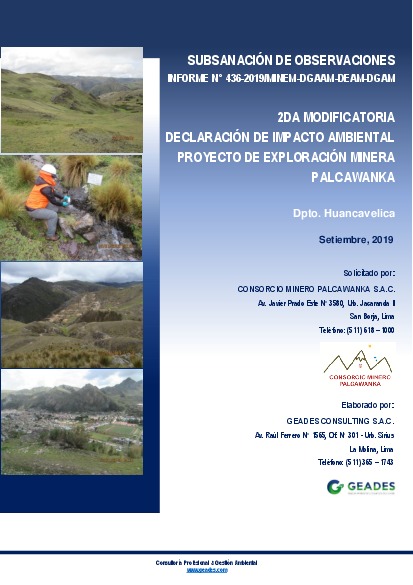 SUBSANACION DE OBSERVACIONES - 2DA MODIFICATORIA DE LA DECLARACIÓN DE IMPACTO AMBIENTAL (DIA) PROYECTO DE EXPLORACION MINERA PALCAWANKA – DPTO. HUANCAVELICA -INFORME N° 436-2019/MINEM-DGAAM-DEAM-DGAM.