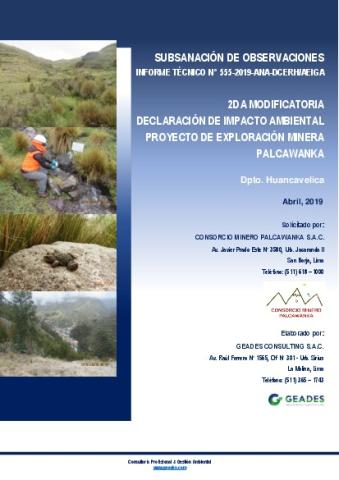 CONSORCIO MINERO PALCAWANKA cumple con presentar la subsanación de observaciones planteadas a la 2da Modificatoria de la Declaración de Impacto Ambiental del proyecto Palcawanka (Dpto. Huancavelica), según el Informe Técnico N° 555-2019-ANA-DCERH/AEIGA.109