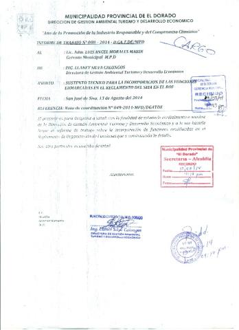 Direccion de Gestion Ambiental Turismo y Desarrollo Economico de la Municipalidad Provincial de El Dorado presento el informe Sustento Tecnico para la Incorporacion de las Funciones enmarcadas en el reglamento SEI en el ROF