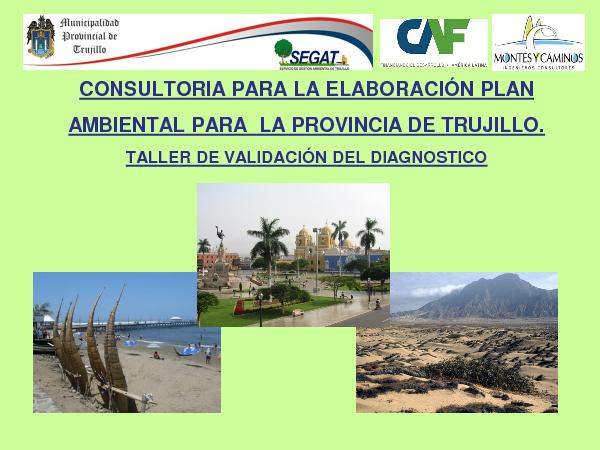 Presentación realizada por la Consultora encargada del Plan Ambiental para la Provincia de Trujillo, Montes y Caminos, en el Taller de Validación del Diagnóstico, realizado el martes 19 de Junio 2012, en el Auditorio Ecológico del Jardín Botánico. Donde la agenda a tratar fue realizar una introducción y actividades desarrolladas, presentación de los resultados y validación del diagnóstico.