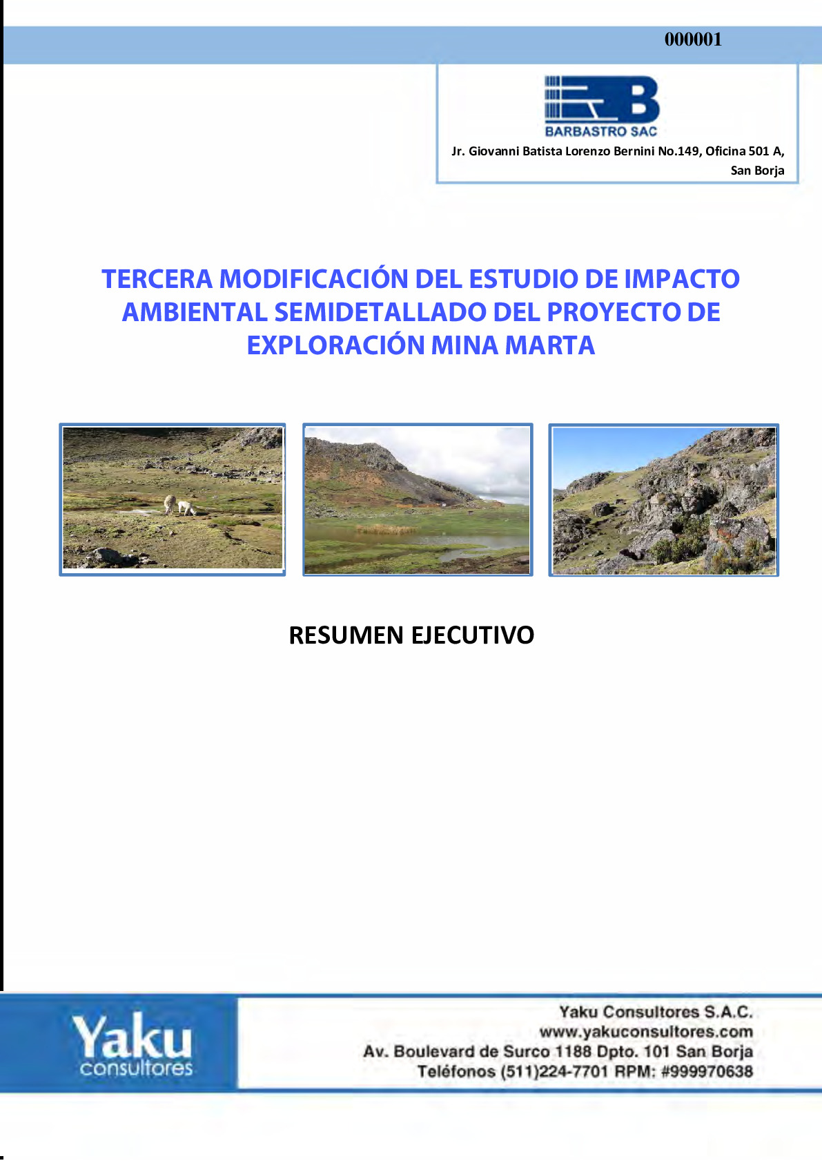 Compañía Minera Barbastro S.A.C. (en adelante Barbastro) viene desarrollando actividades referidas al Estudio de Impacto Ambiental Semidetallado (EIAsd) del Proyecto de Exploración Mina Marta (en adelante el Protecto), el cual se ubica en el distrito de Huando, provincia y región de Huancavelica sobre terrenos de la Comunidad Campesina Tinyacclla, tal como se muestra en la FIGURA 2.1 Ubicación del Proyecto, y de los cuales Barbastro cuenta con todos los derechos superficiales necesarios para poder desarrollar el Proyecto. La presente Modificación del Estudio de Impacto Ambiental Semidetallado del Proyecto de Exploración Mina Marta en adelante MEIAsd (en adelante MEIAsd), evalúa desde la perspectiva ambiental y social, las posibles implicancias que se podrían derivar del desarrollo de las actividades definidas para la etapa de construcción, operación y el cierre del Proyecto. Para mayor información acérquese a la Dirección regional de Energía y Minas (DREM).