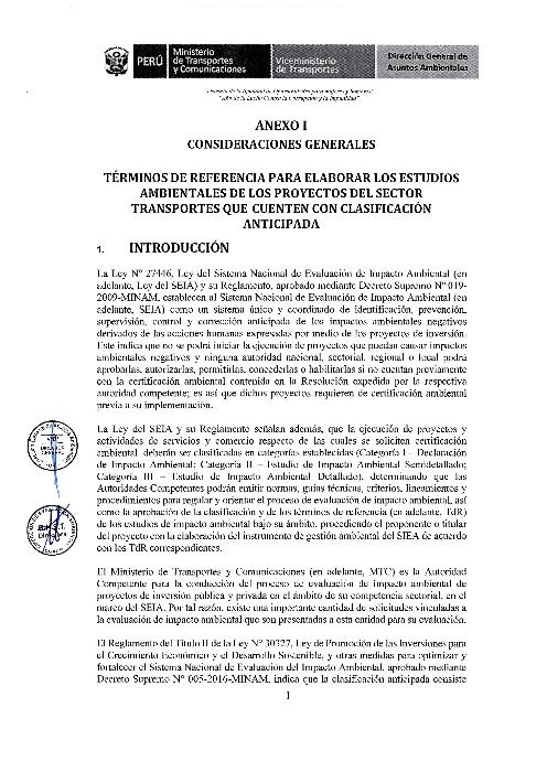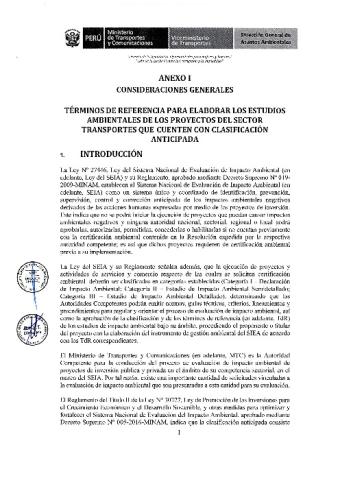 El presente documento detalla los objetivos, alcances y consideraciones (generales y específicas) que se deben tener en cuenta para la formulación y revisión de los estudios ambientales de los proyectos sujetos al proceso de clasificación anticipada del Sector Transportes. Asimismo, se desarrolla el detalle de cada TdR para formular los estudios ambientales de los proyectos con características similares o comunes que deviene del proceso de clasificación anticipada, a fin de contribuir con la optimización de procedimientos administrativos y brindar celeridad en beneficio de los administrados.