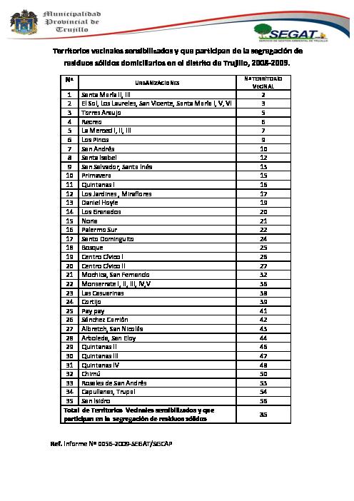En el 2008-2009, el Servicio de Gestión Ambiental de Trujillo logró capacitar a familias de 35 Territorios Vecinales sobre como segregar sus residuos.