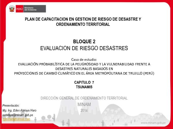 Esta presentación se llevado a cabo en el Plan de Capacitación en Gestión de Riesgo de Desastre y Ordenamiento Territorial que la Dirección General de Ordenamiento Territorial (DGOT) del Ministerio del Ambiente y la Municipalidad Provincial de Trujillo acordaron desarrollar un plan de asistencia técnica, dirigida a implementar y ejecutar las recomendaciones del estudio “Evaluación Probabilística de la peligrosidad y la vulnerabilidad frente a desastres naturales basados en proyecciones de cambio climático” aplicado al Área Metropolitana de Trujillo, y consecuentemente a elevar las capacidades de los funcionarios trujillanos. Las capacitaciones se desarrollaron entre los meses de febrero y junio del 2014 en la ciudad de Trujillo.