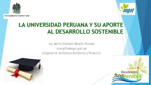 Esta presentación realizada por la ing. Elizabeth Rengifo Paredes, especialista del Servicio de Gestión Ambiental de Trujillo - SEGAT, en el Eco Diálogos por la semana de la Educación Ambiental en el Perú, Tema “Residuos Sólidos” que se llevó a cabo en el Auditorio Del Pabellón H – Universidad Antenor Orrego.