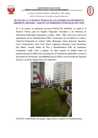 VI REUNION TECNICA DE LOS SISTEMAS DE INFORMACION AMBIENTAL REGIONAL - SIAR DE LOS GOBIERNOS REGIONALES DEL PERÙ
