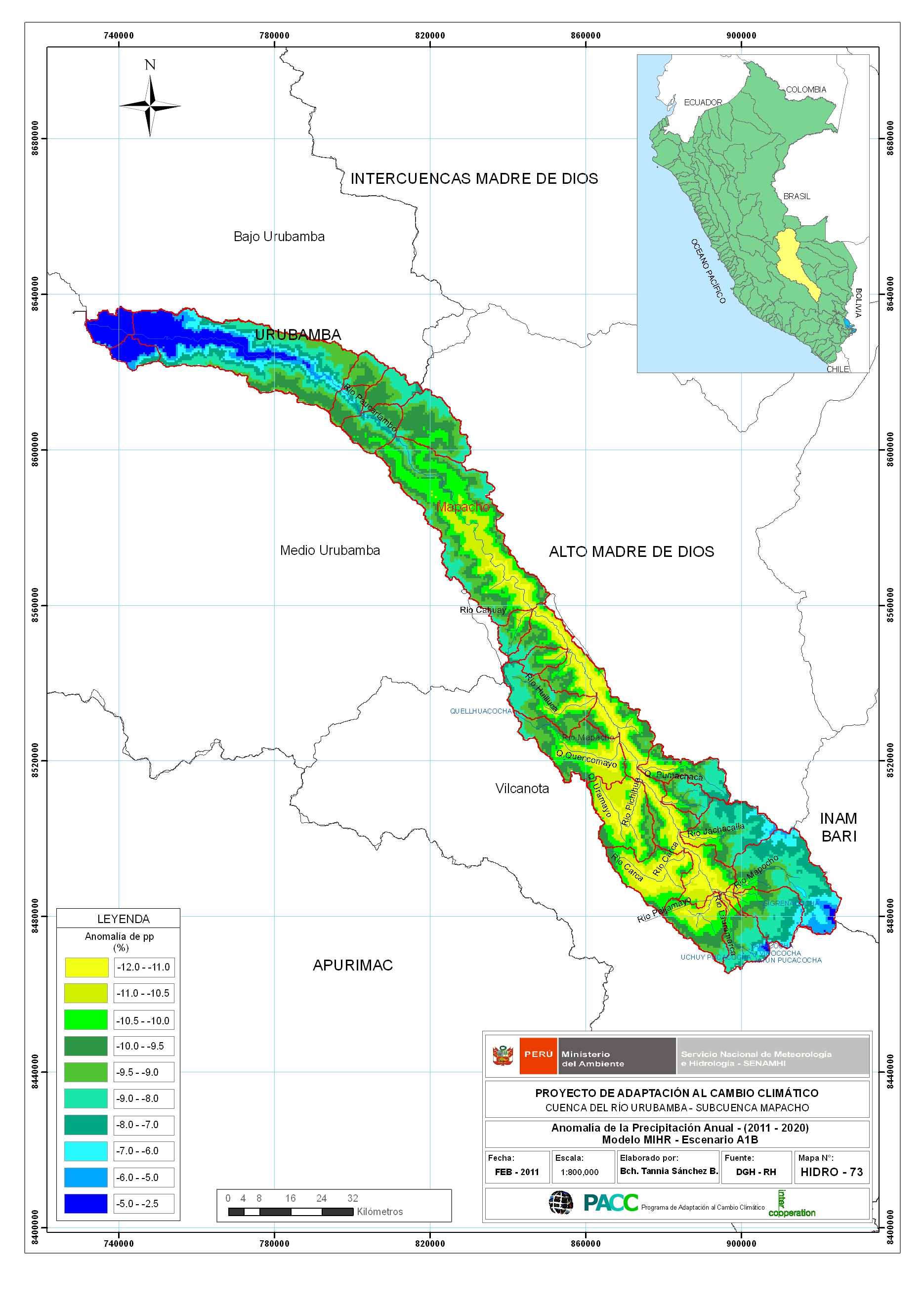 Anomalía de la precipitación anual (2011 - 2020) modelo MIHR - escenario A1B cuenca del río Urubamba - subcuenca Mapacho