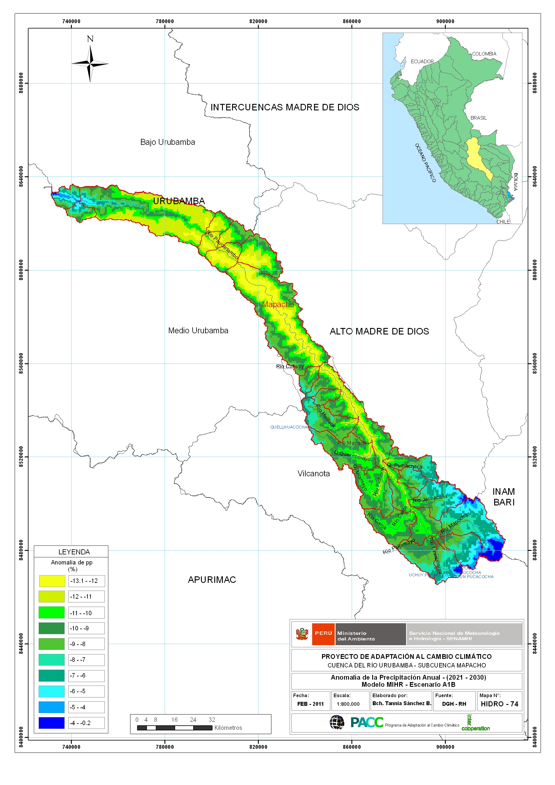 Anomalía de la precipitación anual (2021 - 2030) modelo MIHR - escenario A1B cuenca del río Urubamba - subcuenca Mapacho