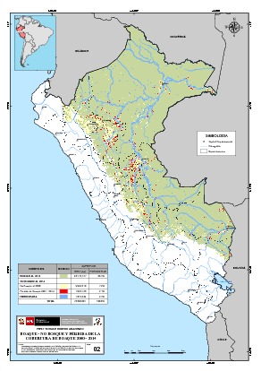 El mapa elaborado por el programa Nacional de Conservación de Bosques para la Mitigación del Cambio Climático muestra la información correspondiente al período 2000 - 2014 sobre áreas y porcentajes de bosque - no bosque y pérdida de la cobertura de bosque a nivel nacional, indicando que la pérdida de bosque en el período 2001 - 2014 es de 2,1 %.
