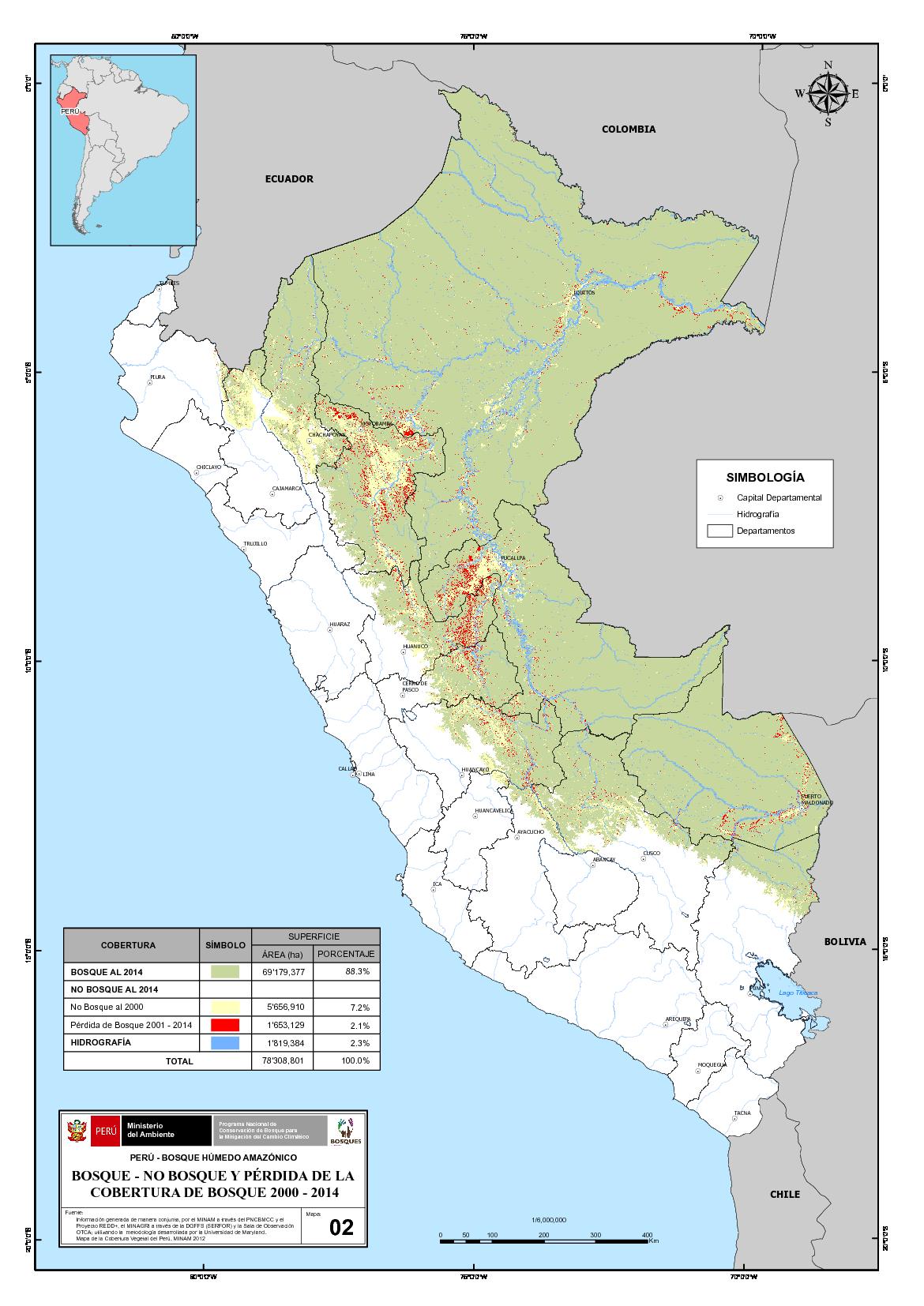Mapa de Bosque - No bosque y pérdida de la cobertura de bosque 2000 - 2014