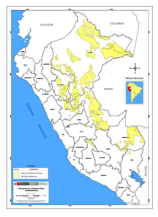 El presente mapa ha sido desarrollado por la Direccion General de Información y Ordenanmiento Forestal y de Fauna Silvestre del Servicio Forestal y de Fauna Silvestre - SERFOR; el cual presenta a nivel nacional las esxtensiones de Bosque de Producción Permanente - BPP