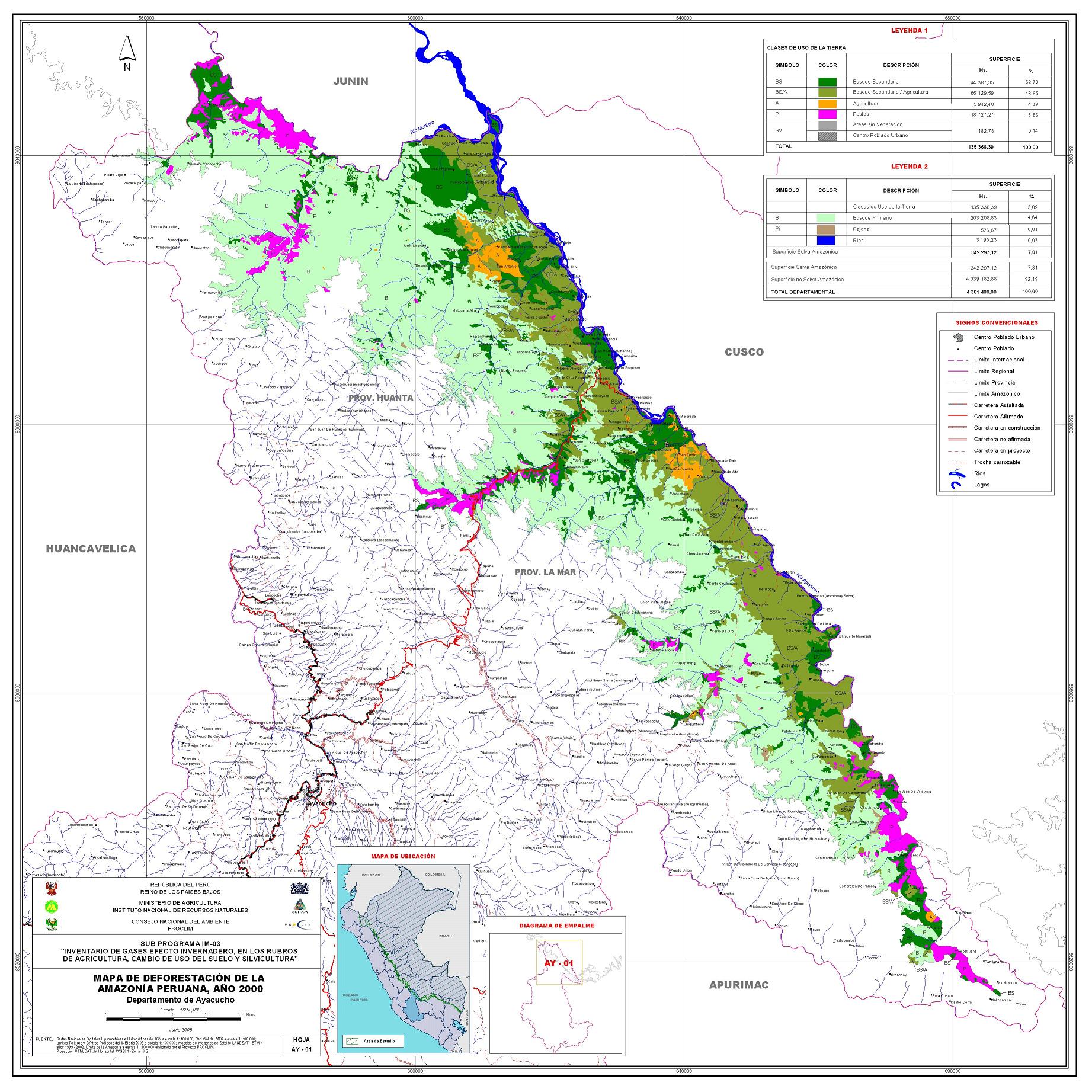 Este mapa muestra la superficie deforestada de la Amazonía peruana al año 2000, del departamento de Ayacucho; en clases de uso de la tierra: cultivos agrícolas, pastizales, bosque secundario, mixturas de cultivos agrícolas y bosque secundario y áreas sin vegetación, también proporciona información que fue generada para el inventario de GEI por efecto del cambio del uso de la tierra. Dentro del marco del Sub-Programa IM-03: Inventario de Gases Efecto Invernadero, en los rubros de Agricultura, Cambio de Uso de Suelos y Silvicultura.