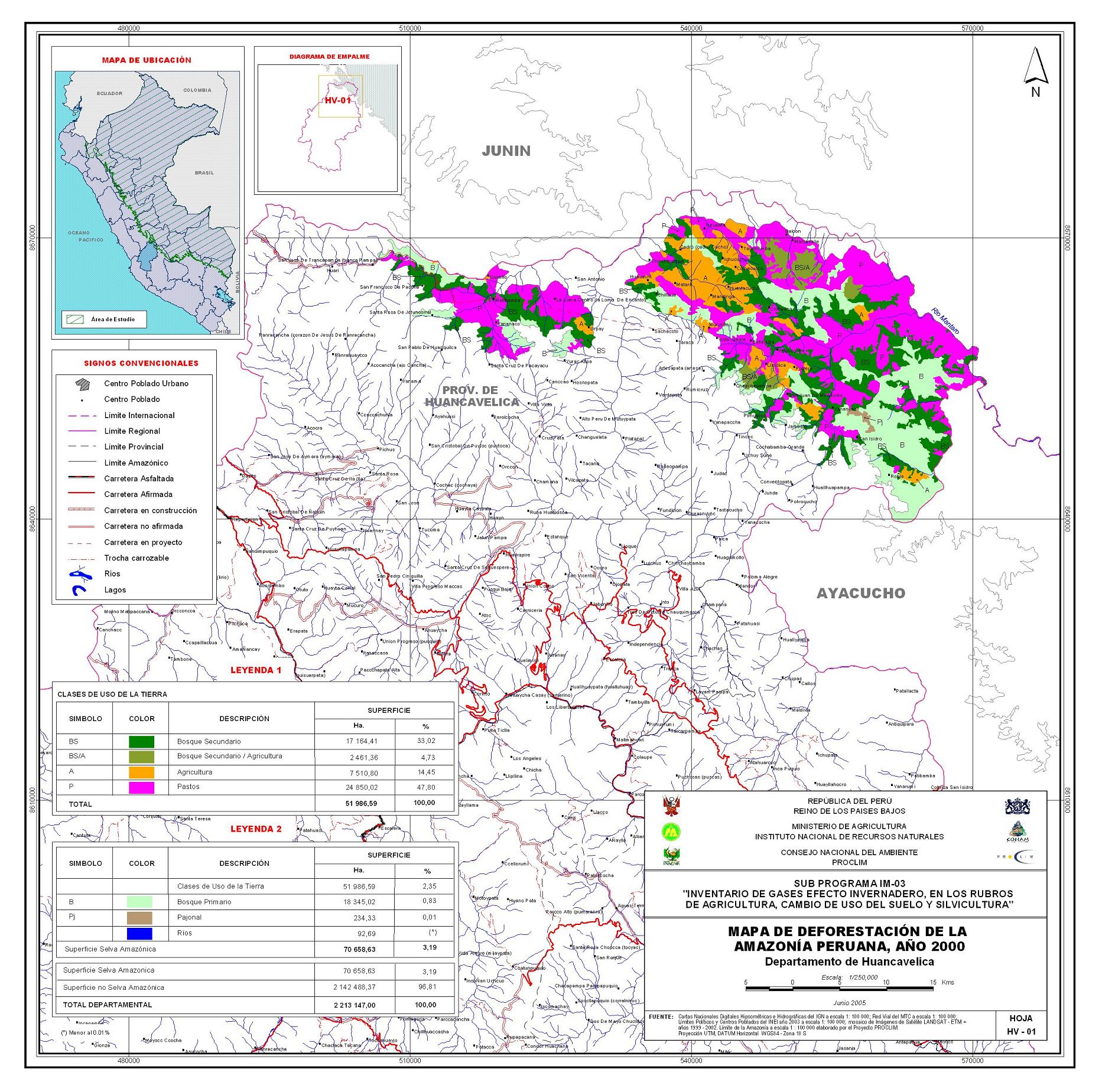 Este mapa muestra la superficie deforestada de la Amazonía peruana al año 2000, del departamento de Huancavelica; en clases de uso de la tierra: cultivos agrícolas, pastizales, bosque secundario, mixturas de cultivos agrícolas y bosque secundario y áreas sin vegetación, también proporciona información que fue generada para el inventario de GEI por efecto del cambio del uso de la tierra. Dentro del marco del Sub-Programa IM-03: Inventario de Gases Efecto Invernadero, en los rubros de Agricultura, Cambio de Uso de Suelos y Silvicultura.