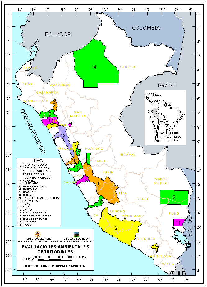 Se muestra un mapa y la lista de las evaluaciones ambientales territoriales que se han realizado en el Perú, estos están identificados y señalados en el mapa que le antecede.