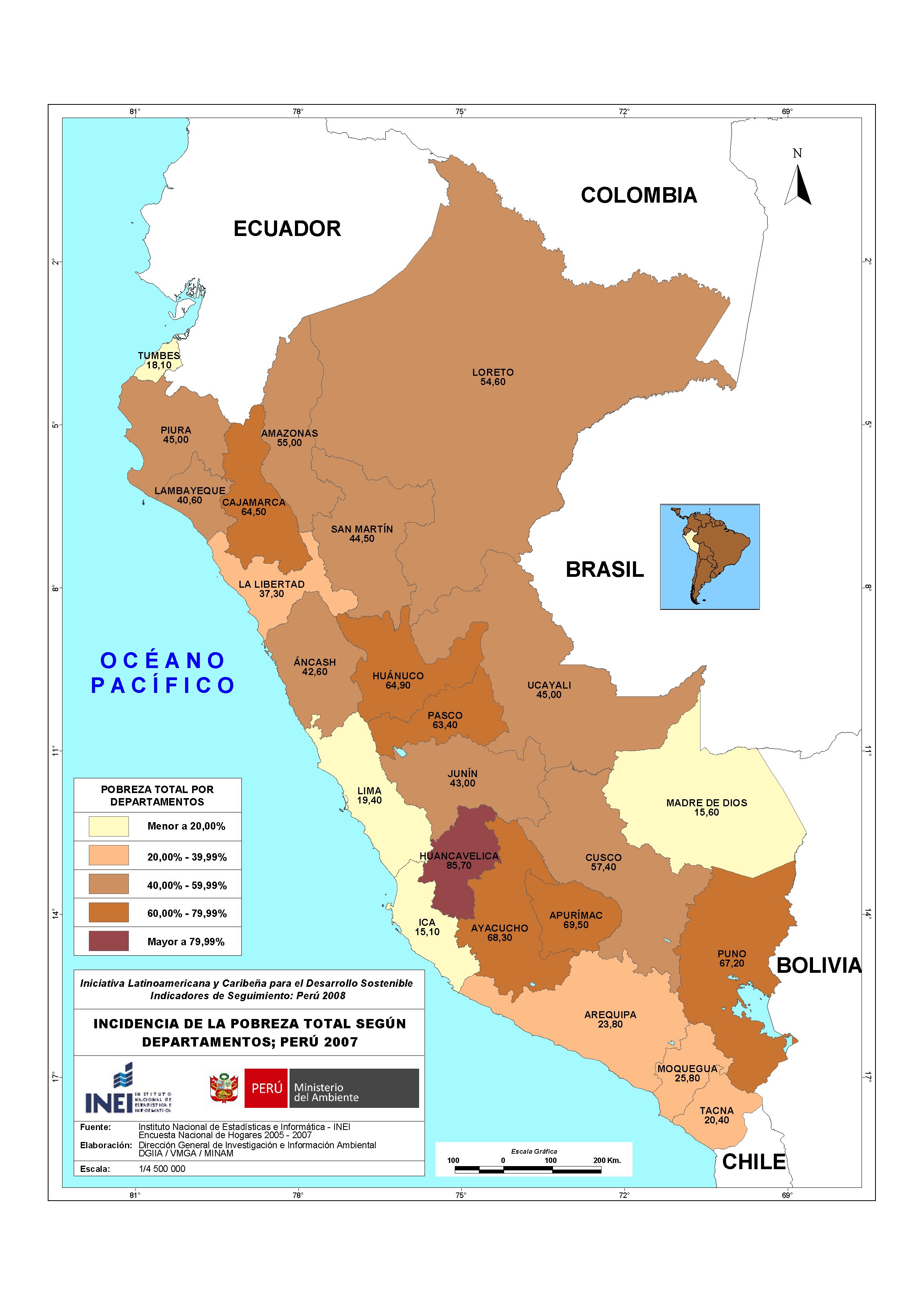 Mapa de Incidencia de la Pobreza Total según Departamentos - ILAC 2008.