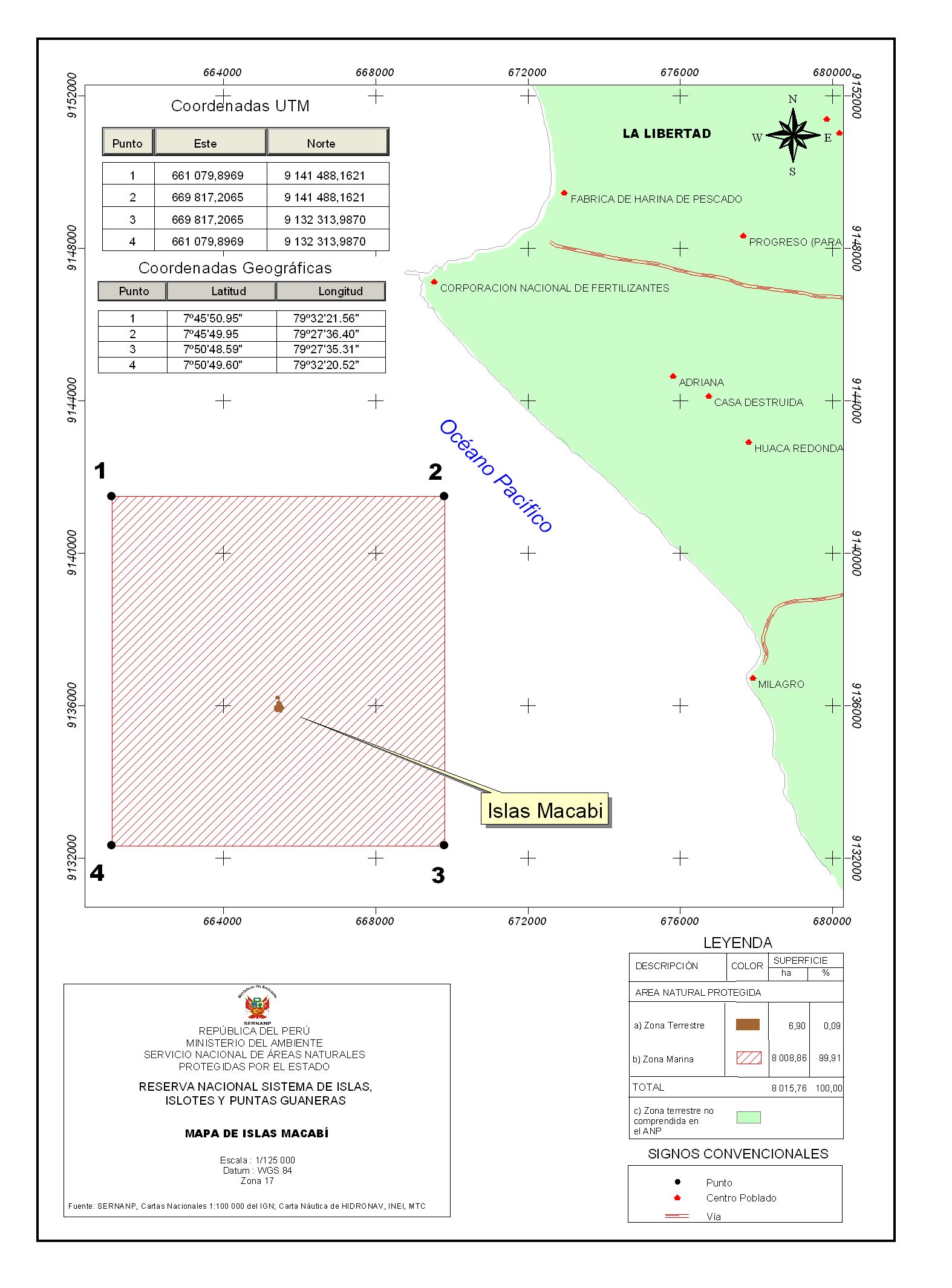 Este mapa muestra el ámbito de las Islas Macabí, ubicado en La Libertad, perteneciente al Sistema de Islas, Islotes y Puntas Guaneras según el Servicio Nacional de Áreas Naturales Protegidas - SERNANP. Enero de 2010.