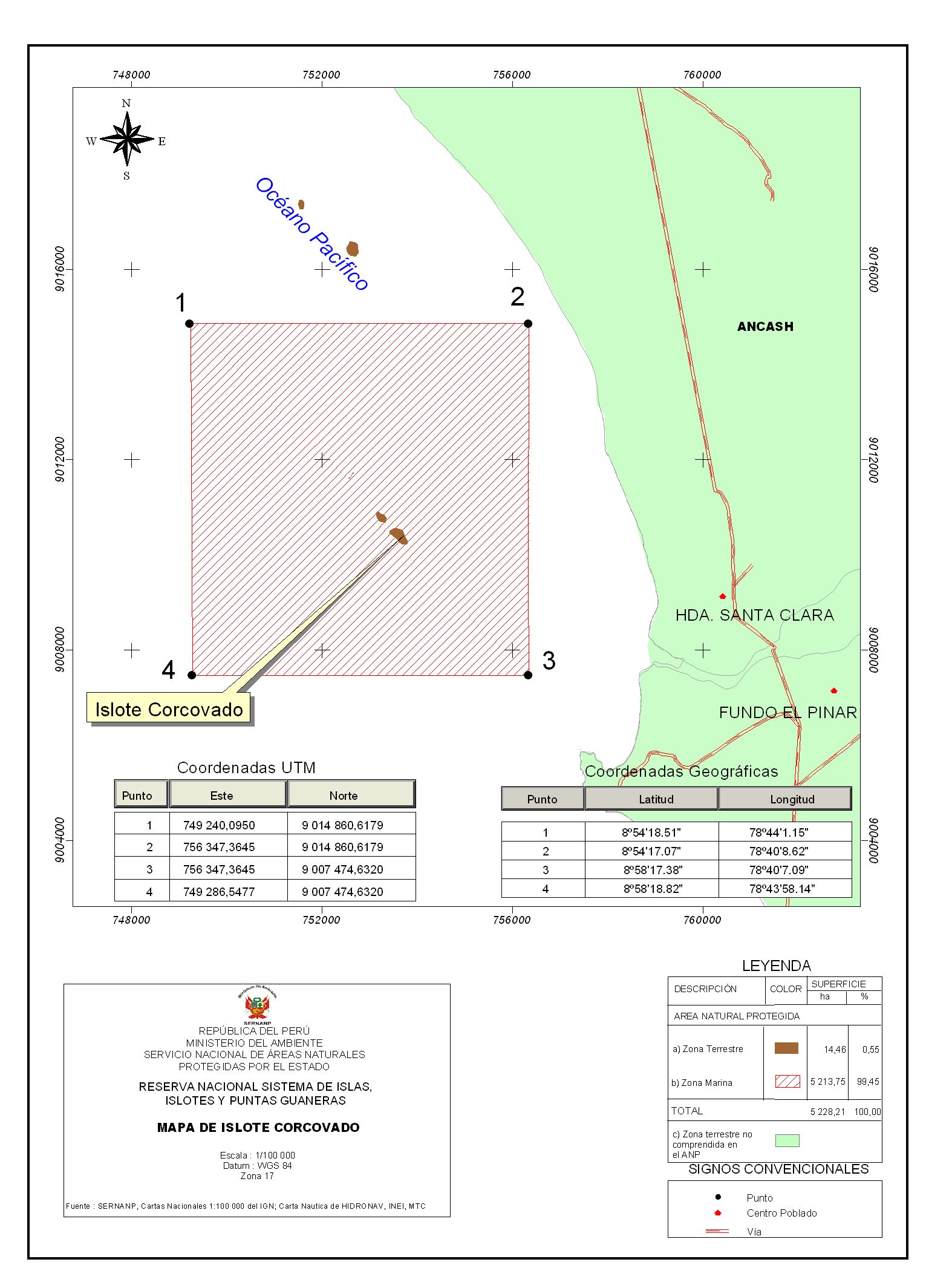 Este mapa muestra el ámbito del Islote Corcovado, ubicado en Áncash, perteneciente al Sistema de Islas, Islotes y Puntas Guaneras según el Servicio Nacional de Áreas Naturales Protegidas - SERNANP. Enero de 2010.