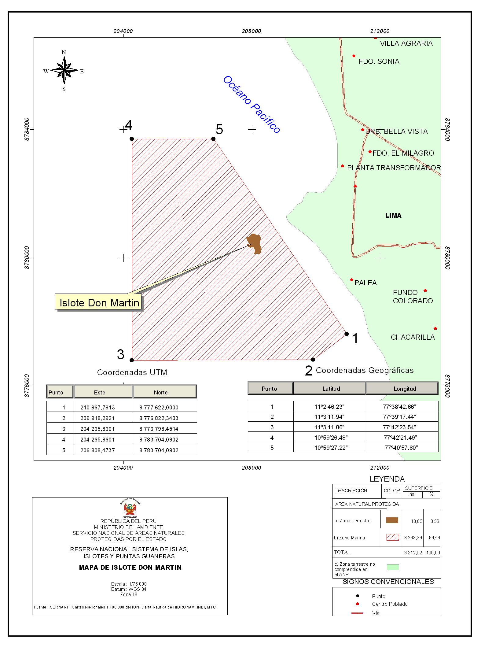 Este mapa muestra el ámbito del Islote Don Martín, ubicado en Lima, perteneciente al Sistema de Islas, Islotes y Puntas Guaneras según el Servicio Nacional de Áreas Naturales Protegidas - SERNANP. Enero de 2010.