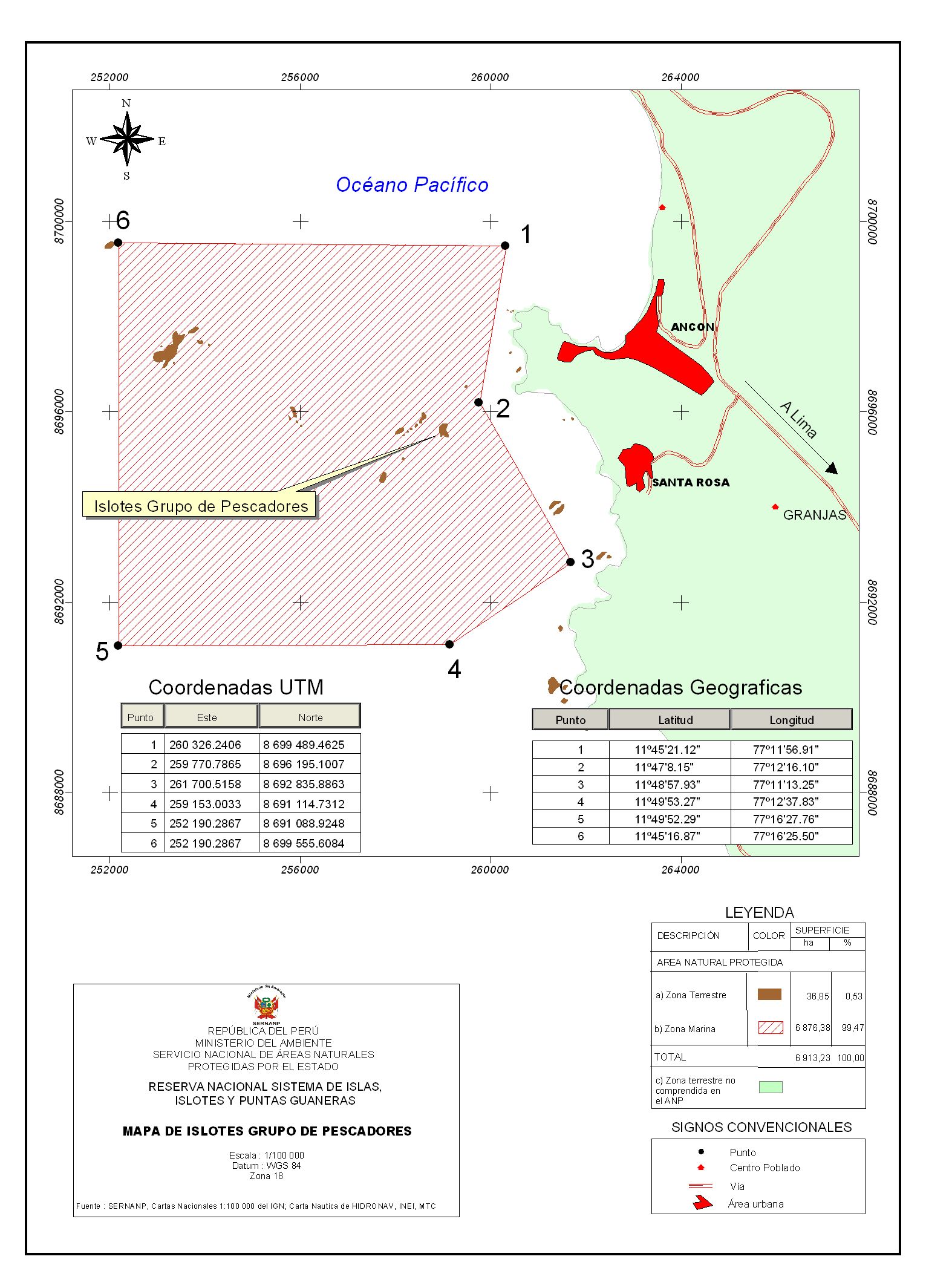 Este mapa muestra el ámbito del Islote Grupo de Pescadores, ubicado en Lima, perteneciente al Sistema de Islas, Islotes y Puntas Guaneras según el Servicio Nacional de Áreas Naturales Protegidas - SERNANP. Enero de 2010.