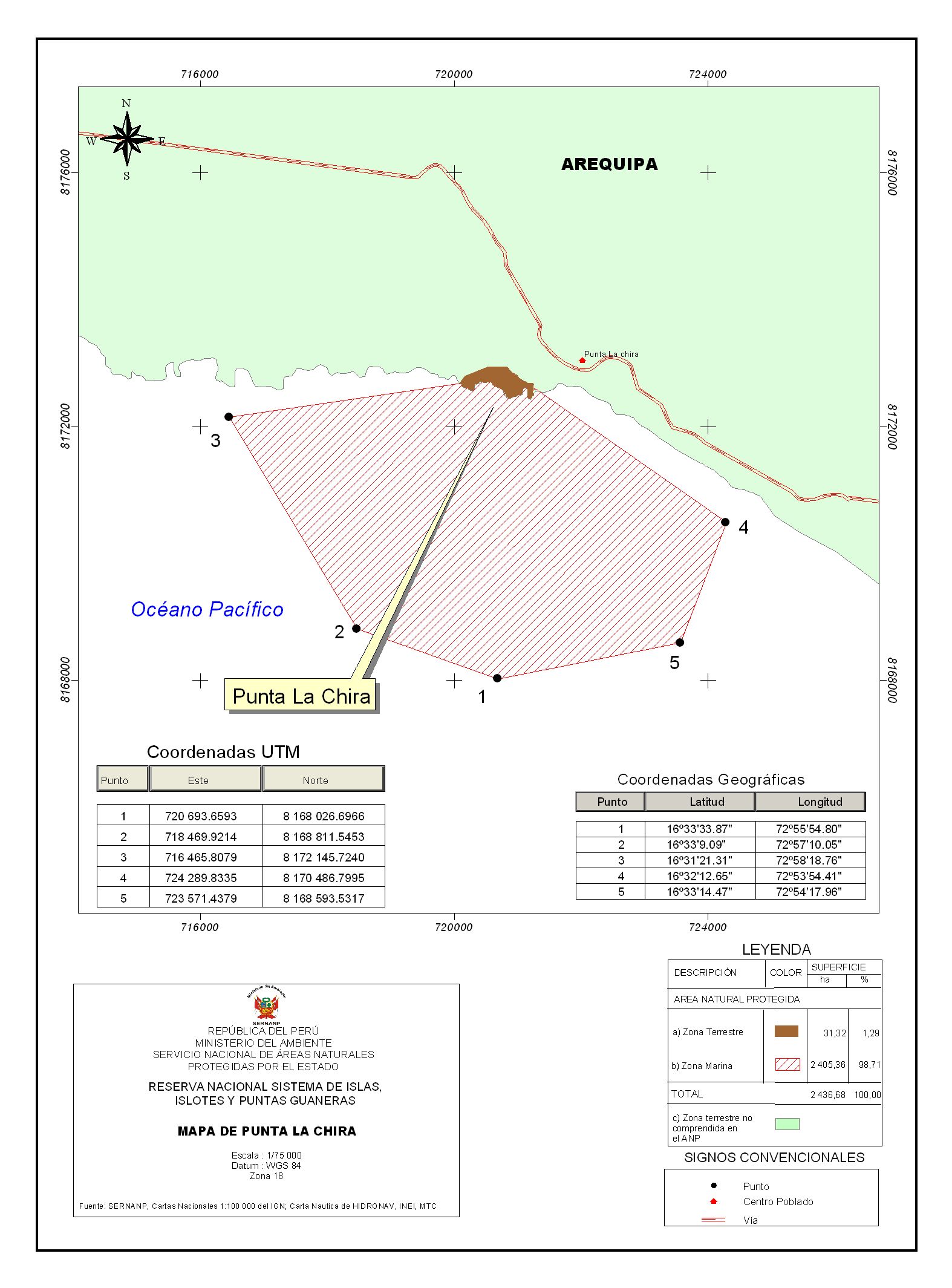 Este mapa muestra el ámbito de la Punta La Chira, ubicada en Arequipa, perteneciente al Sistema de Islas, Islotes y Puntas Guaneras según el Servicio Nacional de Áreas Naturales Protegidas - SERNANP. Enero de 2010.