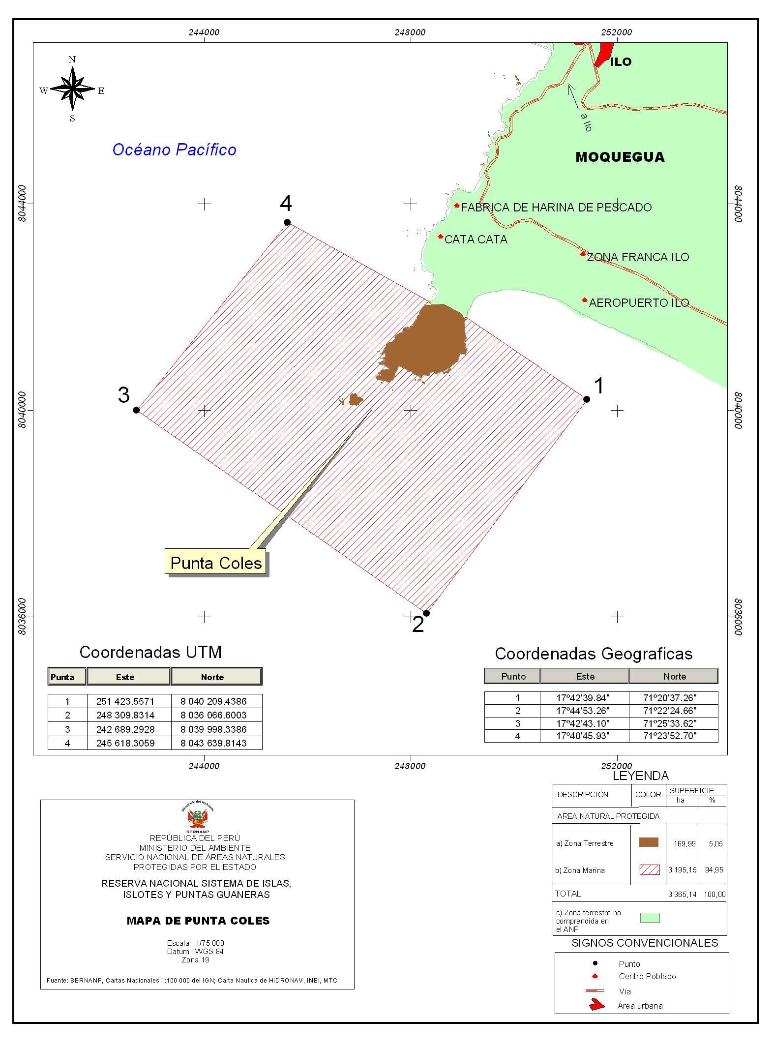 Este mapa muestra el ámbito de la Punta Coles, ubicada en Moquegua, perteneciente al Sistema de Islas, Islotes y Puntas Guaneras según el Servicio Nacional de Áreas Naturales Protegidas - SERNANP. Enero de 2010.